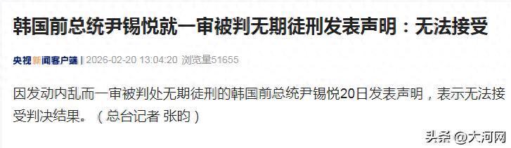 另据央视新闻,因发动内乱而一审被判处无期徒刑的韩国前总统尹锡悦20日发表声明,表示无法接受判决结果。